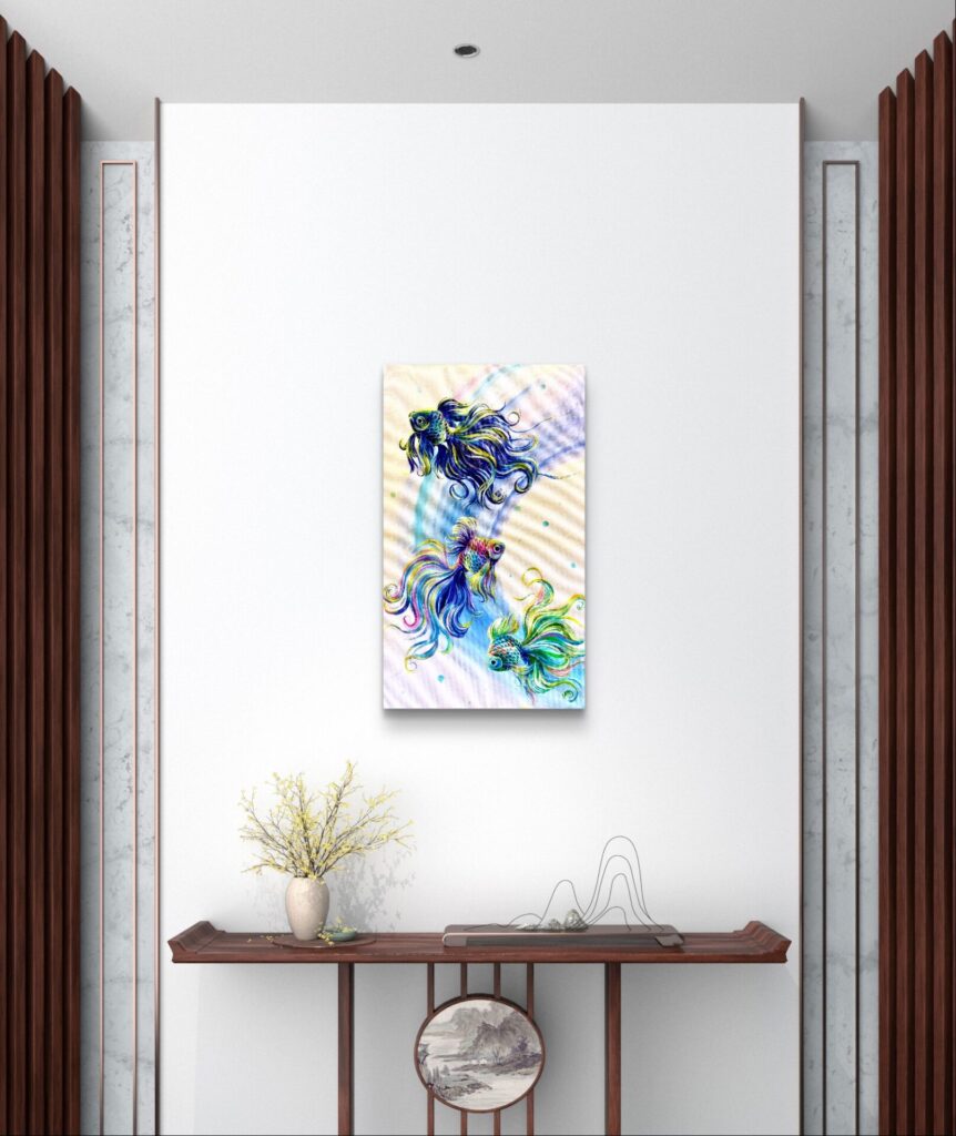 #ネオンコズミック#ミニマルアート#原画販売#和モダン インテリア#抽象と具象#日本画風 モダン#現代アート 日本#癒しの絵#白い絵 インテリア#金魚 絵画