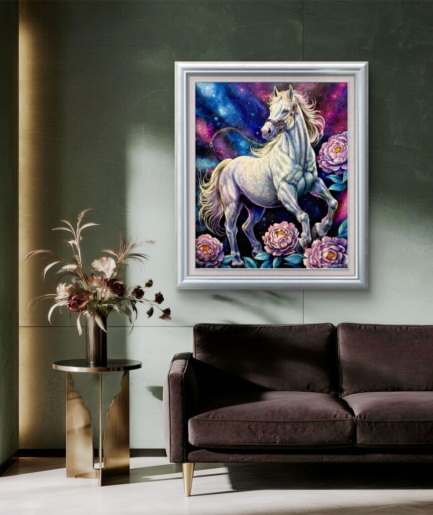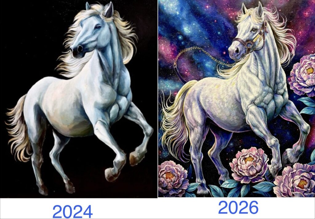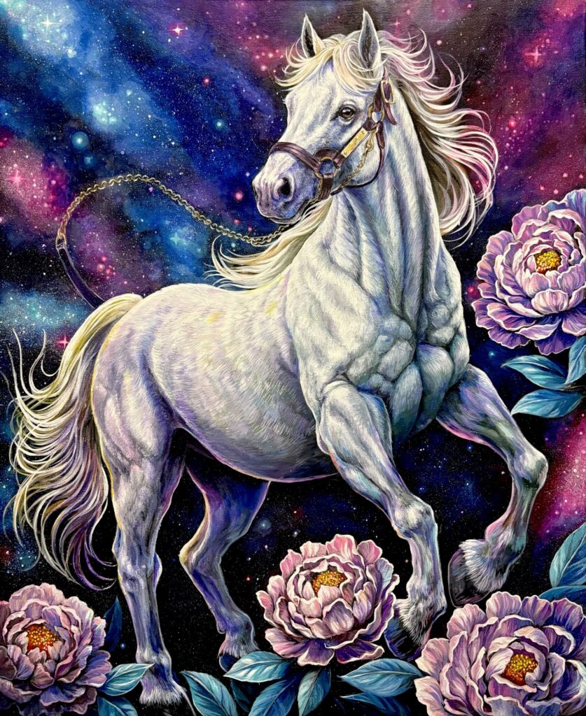 #contemporaryart#whitehorse#おはるのあーと#名馬#宇宙アート#白馬#競走馬#芍薬#銀座ギャラリー#馬の絵