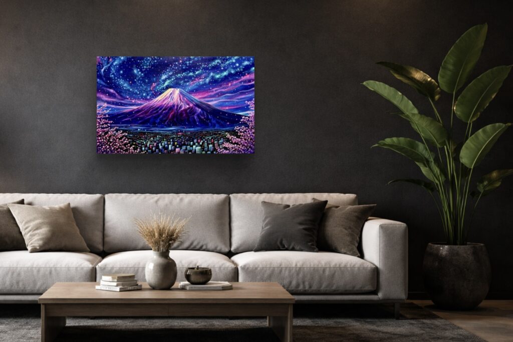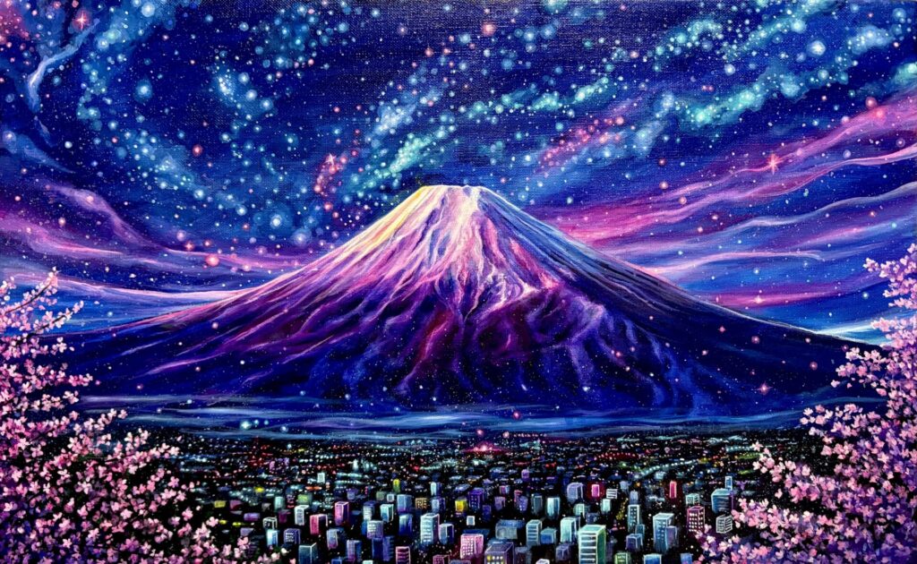 夜の都市と宇宙を重ねた富士山