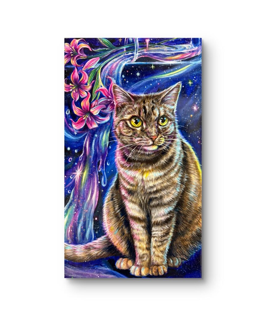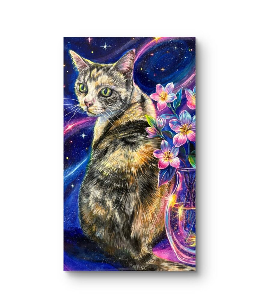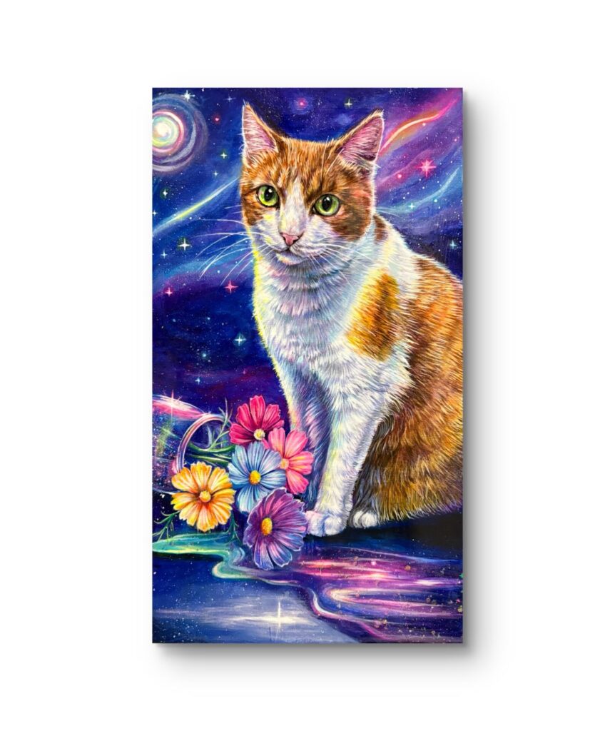花と猫が静かな宇宙の空間に溶け込むようなイメージの作品です。